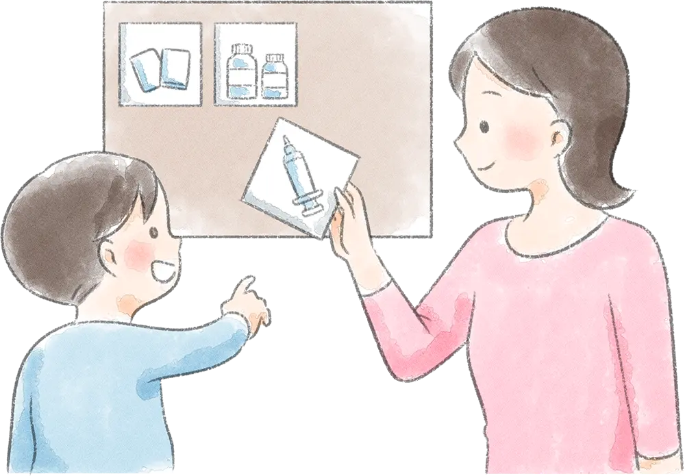 注射にかかわるイラストが描かれたカードなどを用意して、お子さんに見せるのもよいでしょう。